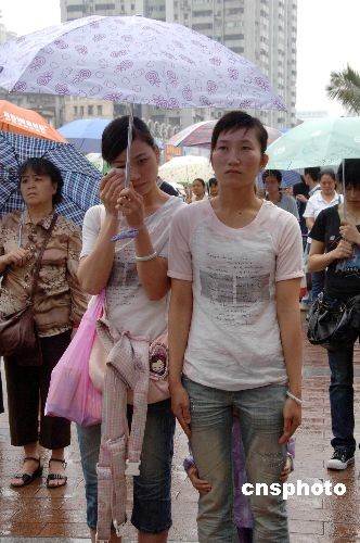 5月19日14時(shí)28分,在廣州上下九步行街上的市民在雨中默哀3分鐘,表達(dá)對(duì)四川汶川大地震遇難同胞的深切哀悼。中新社發(fā) 梁永強(qiáng) 攝