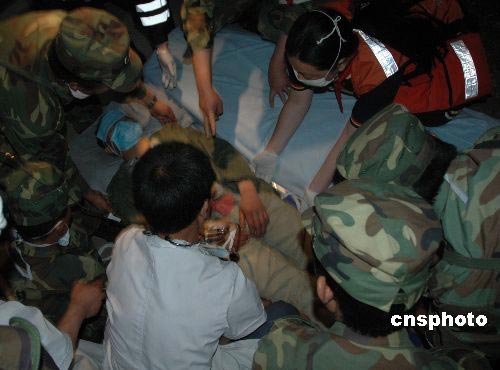 5月20日凌晨4時,在云南駐滇某部劉清泉副師長等百名戰(zhàn)士護(hù)送下,被埋172小時的安縣雎水道禧村六組的礦工彭國華成功獲救,創(chuàng)造了生命的奇跡。中新社發(fā) 王荔 周保全 攝