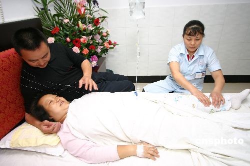 5月21日,護(hù)士給汶川來的產(chǎn)婦陳梅談心。17日上午10時許,重慶市永川區(qū)婦幼保健院順利地把來自四川省汶川地震災(zāi)區(qū)的陳梅產(chǎn)婦生下一男嬰,那是她經(jīng)過10小時,徒步32公里,從汶川震區(qū)撤離出來,才換來的小生命。嬰兒從出生以來,醫(yī)院讓小生命住進(jìn)嬰兒培養(yǎng)箱,以促進(jìn)小生命的身體健康。中新社發(fā) 陳仕川 攝