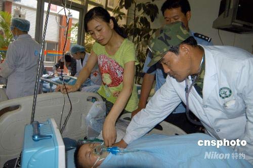 5月21日,在四川汶川5·12大地震中被救出后向解放軍“行隊禮”的北川3歲男孩郎錚在綿陽市解放軍某醫院成功完成斷臂續接手術。給小朗錚主刀的手術醫生、來自第四軍醫大學的張教授說郎錚手掌饒神經雖已損傷,但三個月后會恢復。目前朗錚正在綿陽市解放軍某醫院繼續接受治療。中新社發 成和平 攝