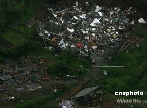 五月二十一日,汶川大地震第十天,從空中可見一位偏遠山村的幸存者回到地震倒塌的家園,面對廢墟。中新社發 賈國榮 攝