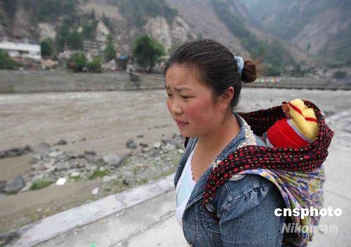 5月22日,23歲的唐先勇背著她不到3個月的孩子到汶川縣草坡鄉打探失蹤父母和爺爺奶奶的消息。中新社發 曾憲平 攝