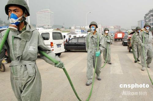 5月23日,中國空軍某部官兵在地震災(zāi)區(qū)綿竹漢旺街頭展開消毒防疫。中新社發(fā) 陳文 攝