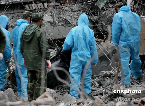 武警官兵五月中旬開始清理汶川大地震受災(zāi)嚴(yán)重的映秀鎮(zhèn),他們在漩口中學(xué)每一次挖掘出來遇難學(xué)生的遺體時(shí),都沉痛默哀。中新社發(fā) 賈國榮 攝