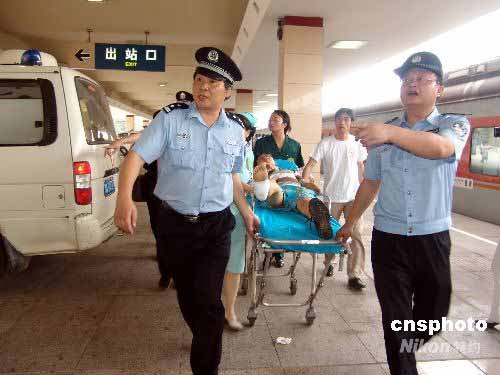 5月24日,從四川德陽開往長沙的救15/4次列車抵達長沙火車站。此趟列車共有238名來自四川地震災區(qū)傷員來長沙接受救治,傷員分別來自北川、安縣、汶川、德陽等地,與其同行的還有67名醫(yī)務人員和239名陪護人員。在長沙鐵路公安、武警官兵和醫(yī)務人員的幫助下,所有傷員分乘130臺救護車迅速被轉移到指定的中南大學湘雅醫(yī)院、湘雅二醫(yī)院、湘雅三醫(yī)院、省人民醫(yī)院、長沙中心醫(yī)院等收治醫(yī)院。中新社發(fā) 郭國權 攝