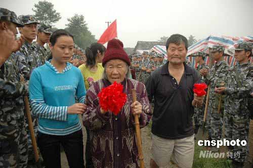 圖:四川震區(qū)89歲老奶奶向解放軍獻(xiàn)花