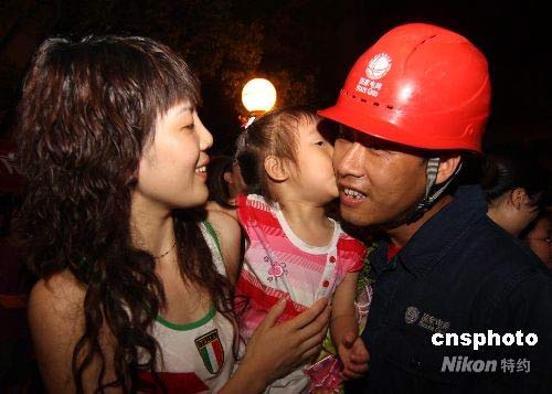 5月25日晚,湖南婁底市電業(yè)局赴四川重災區(qū)綿竹市和什邡市抗震救災一線的第一批20名搶修勇士,在圓滿完成抗震救災保電任務后,勝利返回湖南婁底市。中新社發(fā) 郭國權 攝