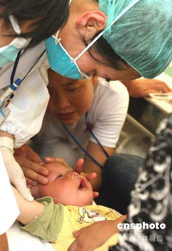 5月26日,由德國(guó)援助的“中德紅十字會(huì)野戰(zhàn)醫(yī)院”在四川大地震的重災(zāi)區(qū)都江堰開(kāi)始接待傷病員。該醫(yī)院由德國(guó)紅十字會(huì)緊急提供一個(gè)全套野戰(zhàn)醫(yī)院設(shè)備和11名醫(yī)療技術(shù)專家,由中國(guó)紅十字會(huì)組織上海華山醫(yī)院、四川相關(guān)醫(yī)院的醫(yī)務(wù)人員接診傷病員,野戰(zhàn)醫(yī)院由手術(shù)室、產(chǎn)房、急診室、放射室、實(shí)驗(yàn)室和藥房組成。圖為一名在地震中幸運(yùn)脫險(xiǎn)的半周歲男童,由于多日在防震棚中生活染上不適癥并發(fā)生呼吸緊迫癥后被緊急送到該醫(yī)院搶救。中新社發(fā) 任晨鳴 攝