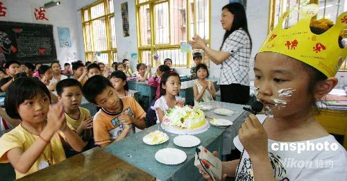5月28日,重慶市永川區(qū)萱花小學(xué)三.三班全體同學(xué)為來(lái)自四川省江油災(zāi)區(qū)的段明陽(yáng)過(guò)了個(gè)簡(jiǎn)單而隆重的生日,同學(xué)們分批次地把自己親手做的生日禮物送給段明陽(yáng),并祝她生日快樂(lè)。段明陽(yáng)向全班同學(xué)清唱了一首《裝扮藍(lán)色的地球》表謝意,并一一把生日蛋糕喂給同學(xué)們,期望能盡早地融入到新的集體里。中新社發(fā) 陳仕川 攝
