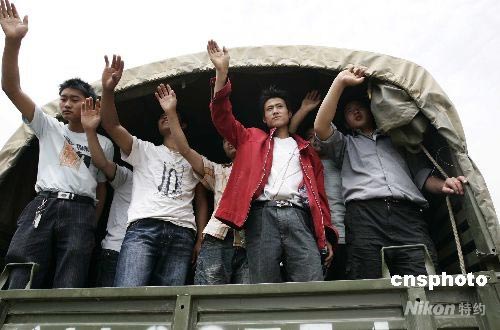 5月28日,四川平武縣南壩鎮(zhèn)19名受災(zāi)青年集體前往沈陽(yáng)打工謀生自救,在搭乘軍車離開時(shí),揮手告別家鄉(xiāng)。平武縣在5. 12地震中損失慘重,25個(gè)鄉(xiāng)鎮(zhèn)18.6萬(wàn)人全部受災(zāi)90%以上房屋全部倒塌,截止27日16時(shí),該縣3014人死亡,3555人失蹤。中新社發(fā) 杜洋 攝