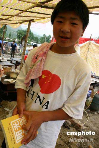 5月28日,在四川汶川大地震重災(zāi)區(qū)之一的彭州,尚未復課的小魚洞小學學生楊青科,拿著一本《陽光心態(tài)》的書翻看,樂觀面對震后生活。中新社發(fā) 楊杰 攝
