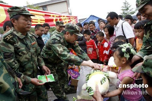 五月三十一日,四川省都江堰市紫坪鋪鎮(zhèn)望江村的孩子們收到了部隊贈送的兒童節(jié)禮物。四川預(yù)備役高射炮步兵師四團負(fù)責(zé)都江堰市望江、黎明、白沙三個行政村的救災(zāi)工作。兒童節(jié)前夕,該團為孩子們準(zhǔn)備了書包、玩具,送給當(dāng)?shù)氐暮⒆觽儭V行律绨l(fā) 慎重 攝