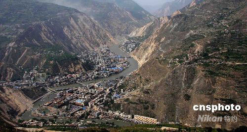 6月2日,汶川縣城中星星點點的藍色救災帳篷為地處重災區的民眾生活增添些許亮色。中新社發 曾憲平 攝