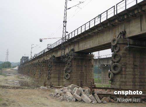 寶成鐵路從位于唐家山堰塞湖下游的綿陽市境內過境。6月6日下午,記者在涪江鐵路橋下看到,所有橋墩已經采取嚴格的保護措施:橋墩底部用鋼筋圍攏,里面裝滿堅硬的大石塊,橋墩臨水面都用數個輪胎纏身,以免泄流時對橋墩產生太大沖擊。中新社發 鄒輝 攝