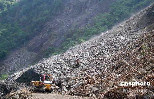 武警交通直屬工程兵的官兵在五月底搶修打通臥龍至耿達鄉的地震受毀公路后,正冒著不停有墜落飛石的危險搶修從耿達鄉至5·12大地震震中映秀鎮的公路。由于從西線進入大熊貓故鄉臥龍的的公路冬季將被冰雪封路三至四個月,因此必須在冬季到來之前打通這條被地震徹底摧毀的“臥龍大熊貓生命之路”。中新社發 江湖 攝