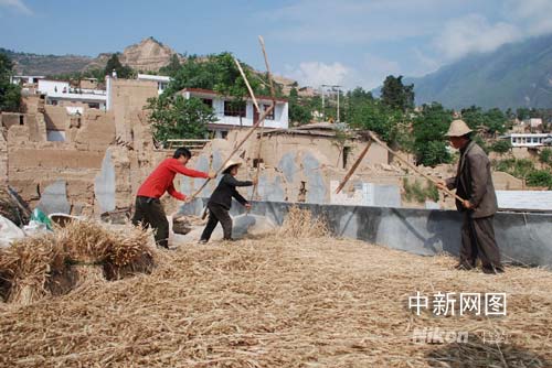 6月9日,甘肅省隴南市武都區桔柑鄉賀家坪村群眾在災后幸存的房頂上用鐮架打麥。近日,武都地震災區群眾已經積極開展生產自救,搶收莊稼。作者:李小鵬