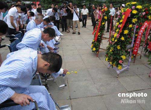 6月11日,在湘雅三醫院接受救治的四川大地震首批康復傷員來到韶山,向毛澤東銅像敬獻花籃,深情鞠躬。明天他們就將返回四川,開始重建家園。中新社發 劉雙雙 攝