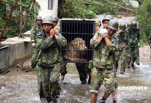 6月13日,什邡市西部驚奇歡樂谷受地震影響被困一個月的一只白虎和兩只白獅,經過空降兵某特種大隊官兵連續5晝夜的營救,在民航學院的協助下成功空運出山,它們將搭乘卡車被送往雅安碧峰峽生態動物園。中新社發 李良泰張東賀 攝