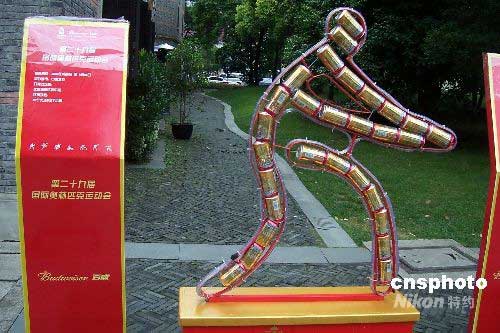 6月14日,一組用易拉罐組成的雕塑亮相上海新天地。雕塑展現了從1896年4月6日在希臘雅典召開的第一屆現代奧運會到2008年8月8日將在中國北京舉行的第29屆奧林匹克運動會的體育項目。中新社發 周東潮 攝