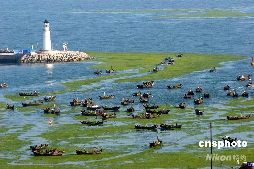 6月25日,2008北京奧運會奧帆基地海域正在打撈滸苔。近日,青島海域滸苔泛濫,有關方面加緊打撈。中新社發 呼蘭江 攝
