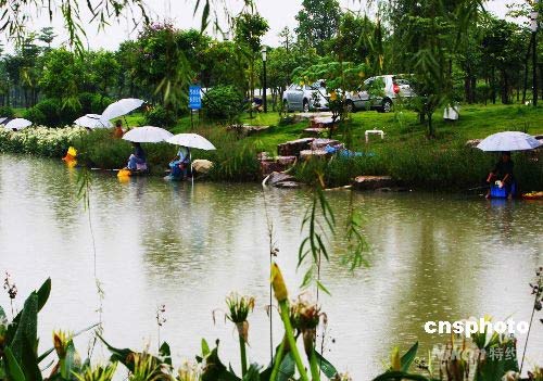 2008年6月26日下午,風(fēng)雨飄搖,但廣東佛山市東平新城佛山公園內(nèi)依然有不少市民冒著風(fēng)雨在此悠閑垂釣。當(dāng)日,臺風(fēng)離開佛山,但雨水遲遲沒有離去。據(jù)廣東氣象臺預(yù)報,未來三天,廣東全省大部將維持大到暴雨。中新社發(fā) 春添 攝