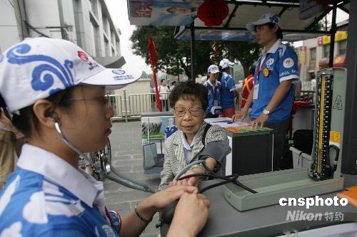 7月1日,北京40萬名城市志愿者在全市500多個志愿者崗亭正式上崗,位于東四北大街的東四奧林匹克社區的志愿者崗亭里,志愿者們都在忙忙碌碌的進行著志愿服務,圖為志愿者義務為市民測量血壓。中新社發 杜洋 攝