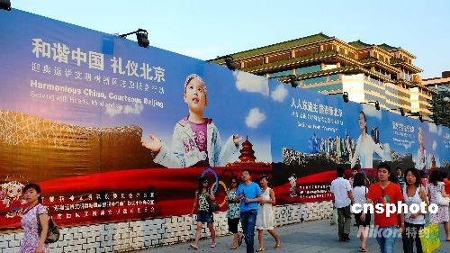 7月6日,北京西單街頭奧運宣傳畫格外引人注目。隨著奧運會臨近,北京大街小巷的奧運氣息越來越濃。 中新社發 張愛東 攝