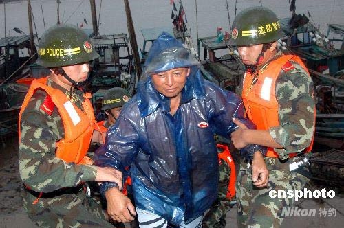 7月18日傍晚,2008年第7號(hào)臺(tái)風(fēng)“海鷗”登陸前,浙江省溫州市龍港鎮(zhèn)有四名漁民困在漁船上無(wú)法撤離。溫州邊防支隊(duì)抗臺(tái)搶險(xiǎn)分隊(duì)官兵火速趕赴救援,成功將他們安全轉(zhuǎn)移上岸。中新社發(fā) 吳水斌 攝
