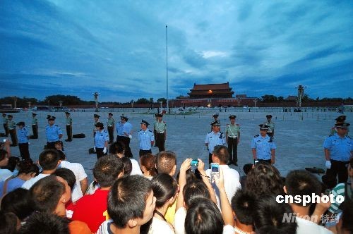 2008年8月1日為我解放軍建軍81周年紀念,天安門廣場舉行盛大升旗儀式,各地游客、奧運期間造訪北京的外國友人一同觀看。中新社發 侯宇 攝