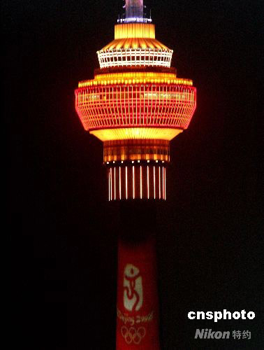 8月1日晚,北京中央電視塔奧運主題夜景燈光以“燈籠”造型為主體,將405米高的世界高塔裝扮得美輪美奐,無比壯觀,成為京西一道綺麗奪目的風景。中新社發 趙振清 攝
