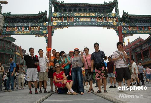8月7日,北京前門大街在經(jīng)歷一年多時(shí)間的保護(hù)、修繕后正式開(kāi)街。現(xiàn)有12家商戶開(kāi)張營(yíng)業(yè),預(yù)計(jì)奧運(yùn)會(huì)之后將全面開(kāi)市。開(kāi)街后,前門大街將實(shí)行24小時(shí)全時(shí)段全覆蓋精細(xì)化城管執(zhí)法模式。當(dāng)日眾多游人前來(lái)參觀前門大街。中新社發(fā) 張雙雙 攝