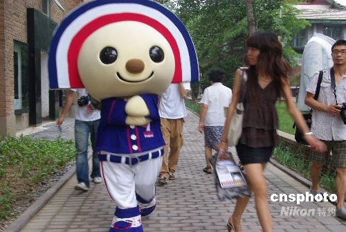 8月13日,中華臺北棒球隊吉祥物OPEN小將亮相北京,引起游客極大興趣和好奇。中新社發 九州 攝