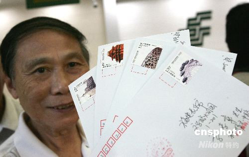 八月二十四日上午,北京奧運會最后一天,一位老伯在福州市郵電大樓高興地拿著剛買到的《奧運會從北京到倫敦》紀念郵票。《奧運會從北京到倫敦》紀念郵票,由中國國家郵政局和英國郵政聯(lián)合發(fā)行。 中新社發(fā) 楊婀娜 攝