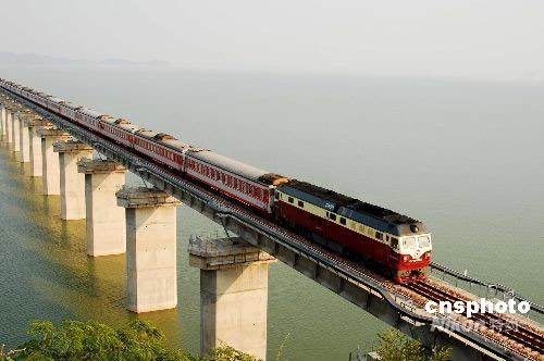9月2日下午,一列客車從鄱陽湖鐵路特大橋上向九江駛去。當天,旅客列車首次通過鄱陽湖。自9月1日起,銅九鐵路先后開行南昌至南京、南昌至寧波、南京至武昌等方向旅客列車,江西境內湖口、彭澤2個縣城從此結束不通旅客列車的歷史。據了解,客車開行后,從九江至南京比目前縮短近10個小時,從南昌至南京也比目前縮短近5個小時,南昌至寧波需繞道杭州的歷史結束,旅客出行更加方便、快捷。圖為9月2日16:45分左右,K506次南京至南昌旅客列車從鄱陽湖鐵路特大橋上駛過。中新社發 胡國林 攝