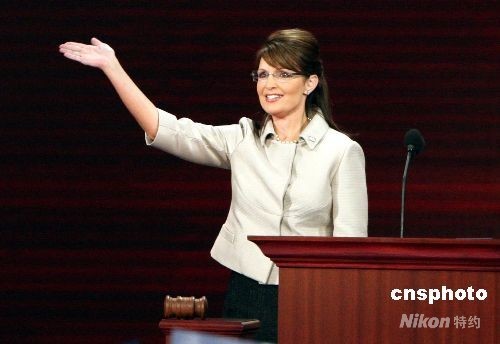 美國阿拉斯加州州長薩拉·佩林,九月三日在明尼蘇達州州府圣保羅舉行的共和黨全國代表大會上發表接受提名演說,成為共和黨歷史上首位女副總統候選人。中新社發 李靜 攝