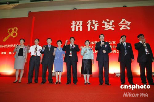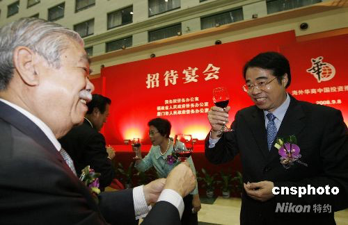 九月八日晚,國務院僑辦在廈門設(shè)宴款待出席“2008海外華商中國投資推介會”高端訪談及“改革開放三十年僑資企業(yè)成就展”的嘉賓,國務院僑辦、福建省僑辦及廈門市僑辦領(lǐng)導上臺感謝僑商僑資為祖國經(jīng)濟建設(shè)付出的努力。中新社發(fā) 王麗南 攝