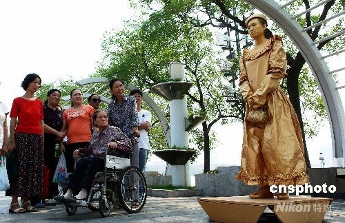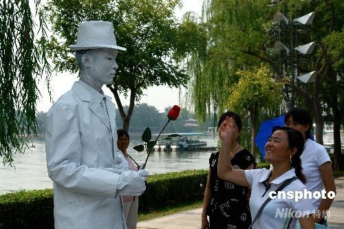 9月14日,在天津水上公園中秋游園會上,由四人組成的人體活雕塑展成了亮點(diǎn)。這些人體活雕塑在進(jìn)行表演的同時,還與游客合影、互動,給中秋游園會增添了靚麗風(fēng)景。中新社發(fā) 展曉仁 攝