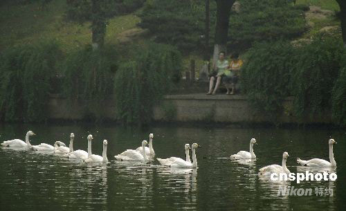 9月23日,天鵝在西湖湖面暢游。當(dāng)日,28只天鵝在闊別西湖3年后重返西湖。據(jù)了解,2005年秋天,有關(guān)部門在西湖孤山處放養(yǎng)了80只白天鵝,為西湖增添了一道風(fēng)景。但后來(lái)因?yàn)閭(gè)別地方出現(xiàn)禽流感,有關(guān)部門就把白天鵝圈養(yǎng)了起來(lái)。中新社發(fā) 引煒 攝