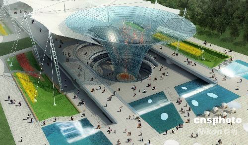 2010年上海世博會中央景觀道路“世博軸”進入全面施工階段,圖為首次公布的“世博軸”主出入口“陽光谷”造型效果。據介紹,“世博軸”的一端也是上海世博園區的主出入口,整個“世博軸”在入口及沿途共設6個巨型圓錐狀“陽光谷”。“陽光谷”采用鋼結構,其功能是讓自然光透過透明“圓錐”傾瀉入地下,滿足部分地下空間的采光,實現節能環保。 中新社發 世博局 攝