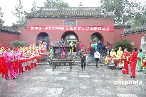 9月27日(農(nóng)歷八月二十八)是我國古代著名政治家、軍事家諸葛亮仙逝1774年忌日,也是明代世宗皇帝欽定的南陽臥龍崗祭拜諸葛亮的秋祭日。當(dāng)天上午,以弘揚(yáng)諸葛亮“鞠躬盡瘁,死而后已”精神為主旨的“中國南陽2008紀(jì)念諸葛亮文化活動(dòng)周”在諸葛亮躬耕地——南陽市臥龍崗武侯祠隆重開幕,吸引眾多國內(nèi)外的專家、學(xué)者和游客前來參觀、朝圣和游覽。9月27日至10月2日“諸葛亮文化周”期間,武侯祠將舉行大型民間藝術(shù)表演、漢代樂舞表演、畫家走進(jìn)臥龍崗、三國謎語有獎(jiǎng)競猜、品嘗三國文化宴等豐富多彩的活動(dòng)。中新社發(fā) 熊運(yùn)彬 攝