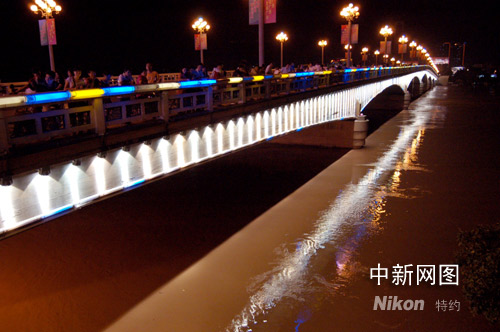 9月29日晚上,廣西南寧眾多市民和游客爭睹8年來邕江最大洪水。受今年第14號臺風(fēng)“黑格比”的影響,最近幾天廣西江河水位不斷上漲,9月30日凌晨4時,邕江8年以來最大洪峰通過南寧,最大洪峰水位達(dá)到75.89米,超出警戒水位2.89米,沿江兩岸大堤下許多樹木和路燈被淹沒。由于8年前南寧修筑了高規(guī)格的防洪大堤,因此此次洪峰對南寧主城區(qū)沒有影響,但對下游邕寧區(qū)造成嚴(yán)重影響。目前,邕江水位開始緩慢回落。由于洪水適逢國慶假期,許多市民和游客到江邊爭睹滔滔江水。中新社記者 劉萬強(qiáng) 攝