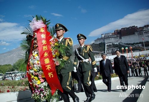10月1日上午,在布達拉宮廣場上舉行升國旗儀式后,在紀念碑前向革命先烈敬獻了花籃,緬懷為西藏革命和建設事業(yè)作出重大貢獻的革命前輩們。圖為武警戰(zhàn)士抬著花籃走向布達拉宮廣場上的紀念碑。中新社發(fā) 周波 攝