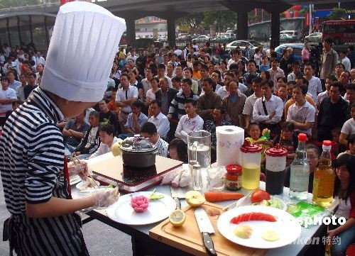2008年10月1日,武漢市漢口航空路一廚藝大賽現場,11歲女童余秋萍上臺和成年人一起比賽烹調技藝。據了解,小學生余秋萍從9歲就開始學習廚藝,經常在家炒菜做飯,認為自己的手藝不錯,就報名參加了這次比賽。中新社發 孫新明 攝