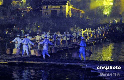 十月六日晚八時,江西省首個大型戶外實景演出《井岡山》,再現當年八十年前紅軍挑糧上井岡山情景。這場《井岡山》的演出由近千名當地農民參演,采用一千多盞燈光、五萬五千多平方米的舞臺。中新社發 段長征 攝