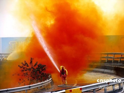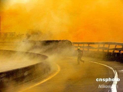 10月7日10時11分,位于杭甬高速公路寧波段塘出口處,一裝載29噸硝酸的槽罐車在自西向東行駛過程中,撞擊護(hù)欄后側(cè)翻,發(fā)生泄露事故。中新社發(fā) 何蔣勇 攝