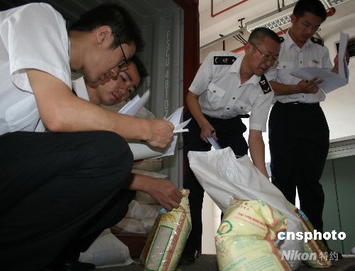 10月9日,參展第五屆中國—東盟博覽會的首批貨物順利抵達(dá)南寧。該批貨物為來自柬埔寨的大米、酒和木制家具等,廣西出入境檢驗檢疫局和南寧海關(guān)在確保對疫病疫情有效監(jiān)管的前提下,實行“聯(lián)合辦公、共同查驗、一站式服務(wù)”的工作機制,迅速為展品辦理通關(guān)手續(xù)。中新社發(fā) 林艷華 攝