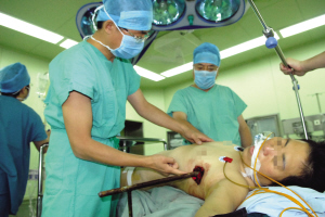 來到醫院后王女士已經出現意識模糊,同時伴有劇烈的胸痛。胸外科主任張臨友教授和副主任徐廣全教授迅速組織相關科室人員會診,爭取快速摸清患者胸腔內的情況和鋼筋對各器官造成的損傷。由于消防隊員在切割鋼筋時怕傷到王女士,所以切割點離傷口較遠,造成留在體外的鋼筋較長,傷者無法進入CT拍攝影像,給診斷帶來了很大的困難。醫生只得為王女士進行了胸部的X光片檢查。依靠豐富的臨床經驗和X光片,醫生判斷王女士的肺組織已經損傷,必須立即開胸探查。