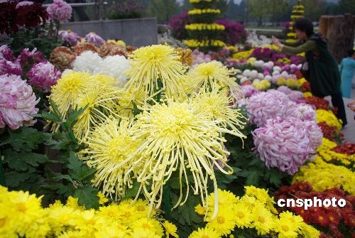 10月13日,游客在北京植物園菊花展區(qū)內(nèi)流連忘返,頻頻發(fā)出贊嘆之聲。在本屆花展中,公園將菊花作成了各種菊花塔、盤龍?jiān)煨停煌瑫r(shí)還用菊花打造了色彩明快的花帶。目前園中有1000多個(gè)品種10萬株菊花。中新社發(fā) 九州 攝