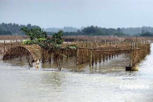 2008年10月17日,瓊海市嘉積鎮(zhèn)已被洪水浸泡6天5夜的瓜菜已全部枯死。海南持續(xù)強(qiáng)降雨目前已停止,但瓊海萬泉河畔洪水消退十分緩慢,低洼地帶的農(nóng)田已經(jīng)浸泡了6天5夜,泡在水里的香蕉等瓜果作物損失嚴(yán)重。目前瓊海市群眾在農(nóng)技人員幫助下,采取各種措施抗災(zāi)保苗。當(dāng)?shù)厝罕娬f洪水如此長時(shí)間不退歷史上很少見。中新社發(fā) 蒙鐘德 攝