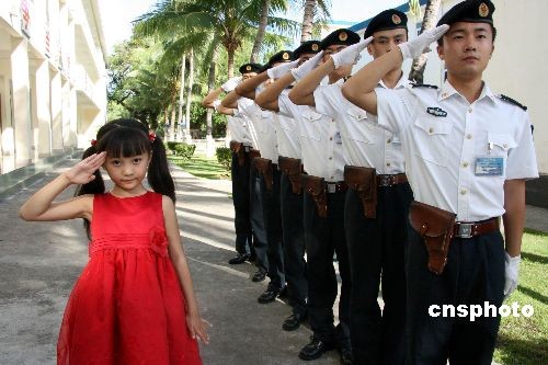 10月21日下午,在北京奧運(yùn)開幕式上一曲成名的小女孩林妙可,利用參加三亞城市精神評選活動暨奧運(yùn)冠軍三亞行晚會之際,來到海軍駐南國三亞某保障基地標(biāo)桿式單位警勤邊參觀。到該連后,林妙可在趙勛兵副連長的帶領(lǐng)下,參觀了連隊內(nèi)務(wù)、健身房、榮譽(yù)室。中新社發(fā) 郜宏亮 攝